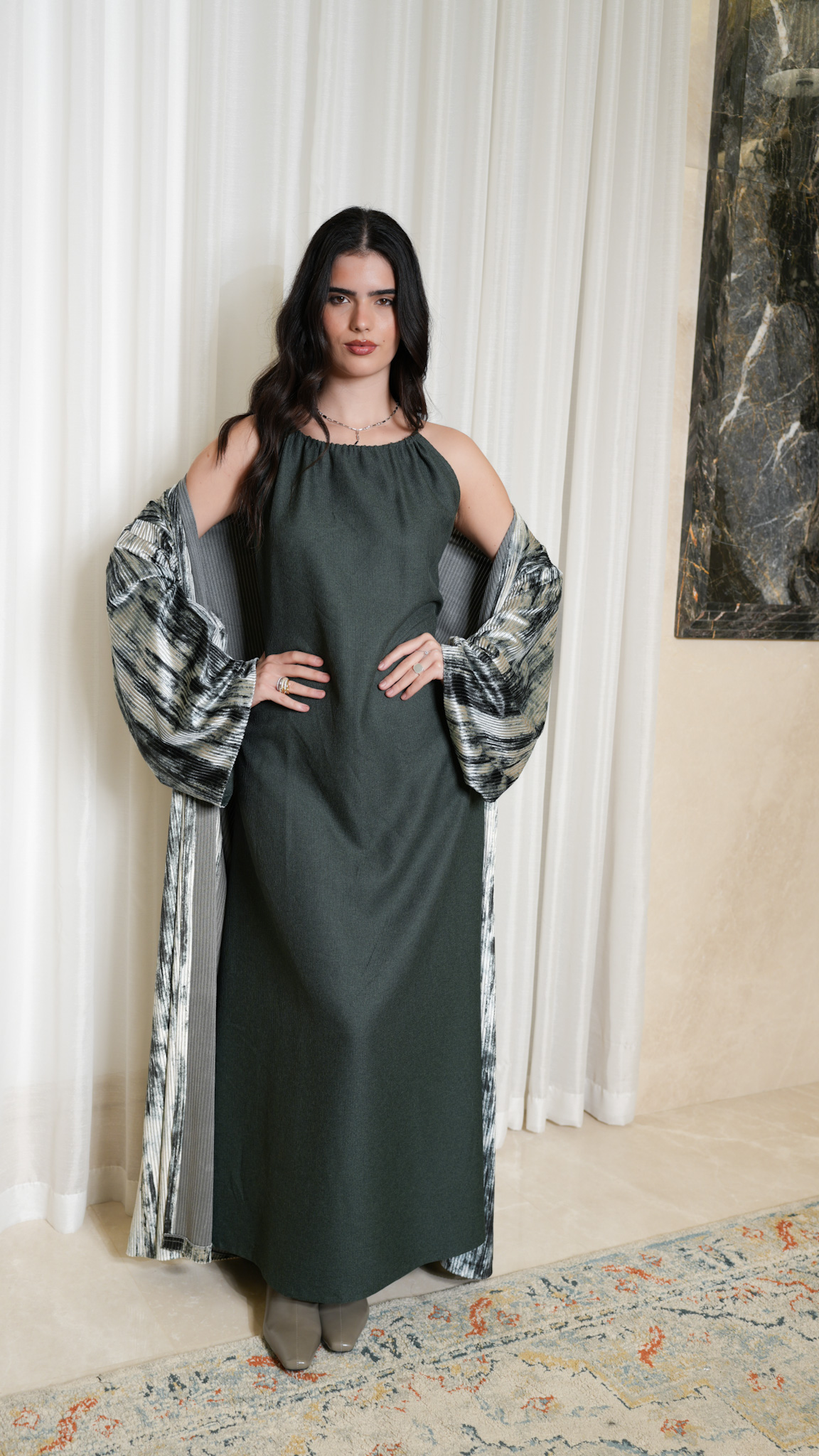 Dress has a belt you can tie the back or the front, and Bisht